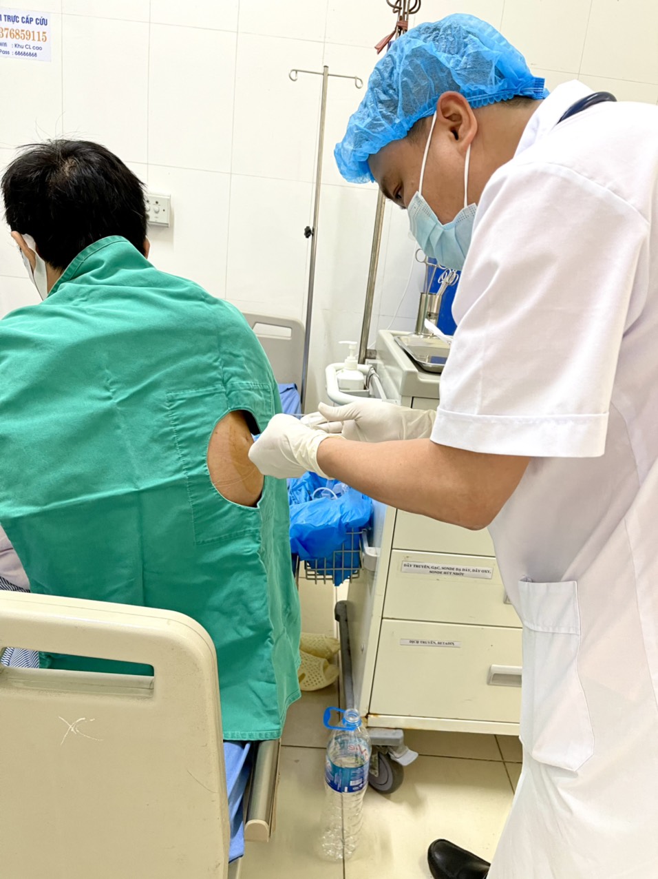 + Đo HA, đếm mạch, nhịp thở, xem bệnh nhân có ho ra máu không.