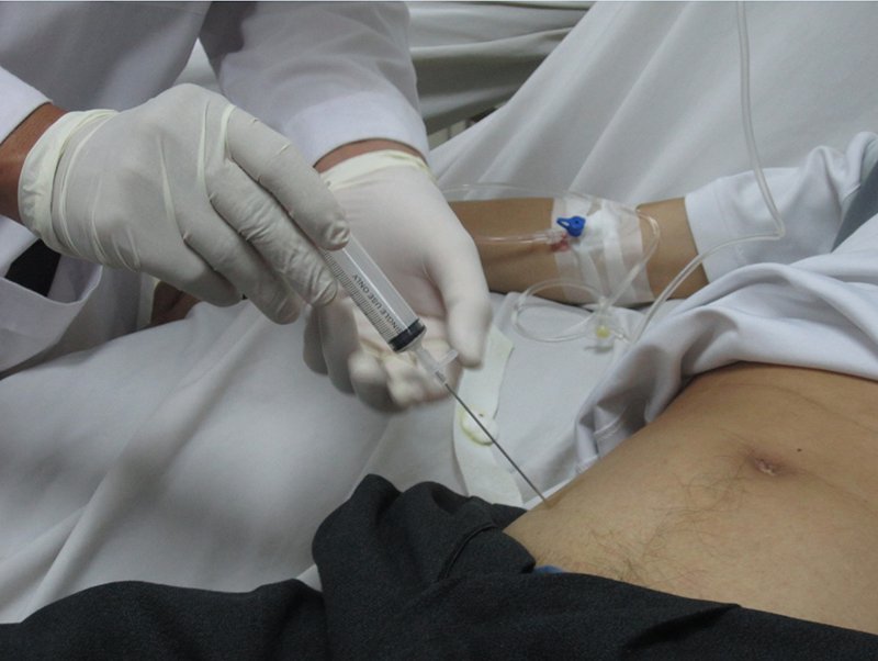 - Chọc kim tại điểm đã gây tê, vuông góc với thành bụng. Khi kim vào khoang màng bụng, cảm giác sựt và nhẹ tay, sau đó hút thử và giữ cố định kim sát vào thành bụng.